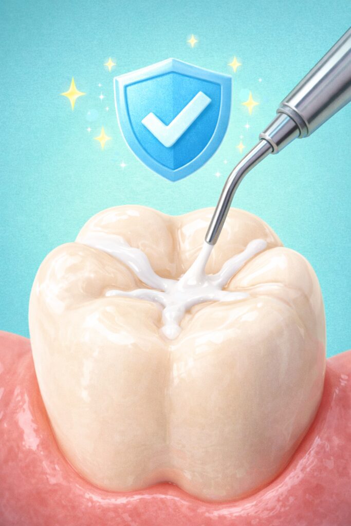 - Fissure Sealant: Gigi geraham anak sering memiliki ceruk yang sangat dalam (fissure). Dokter akan “menambal” celah tersebut dengan lapisan pelindung agar sisa makanan (terutama cokelat/permen) tidak tersangkut di sana.
