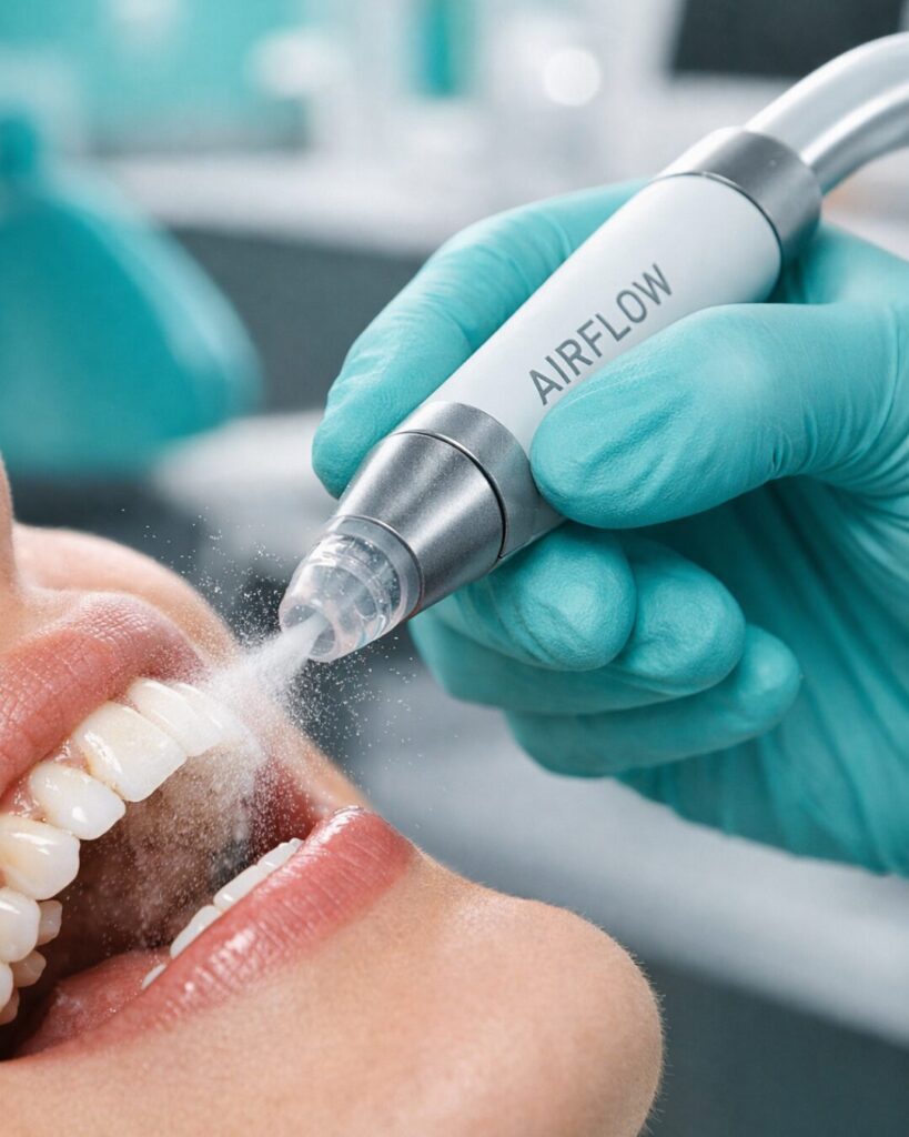 Alat ini bekerja dengan menyemprotkan uap air hangat yang dicampur dengan partikel bubuk pembersih khusus (prophylaxis powder). Hasilnya?